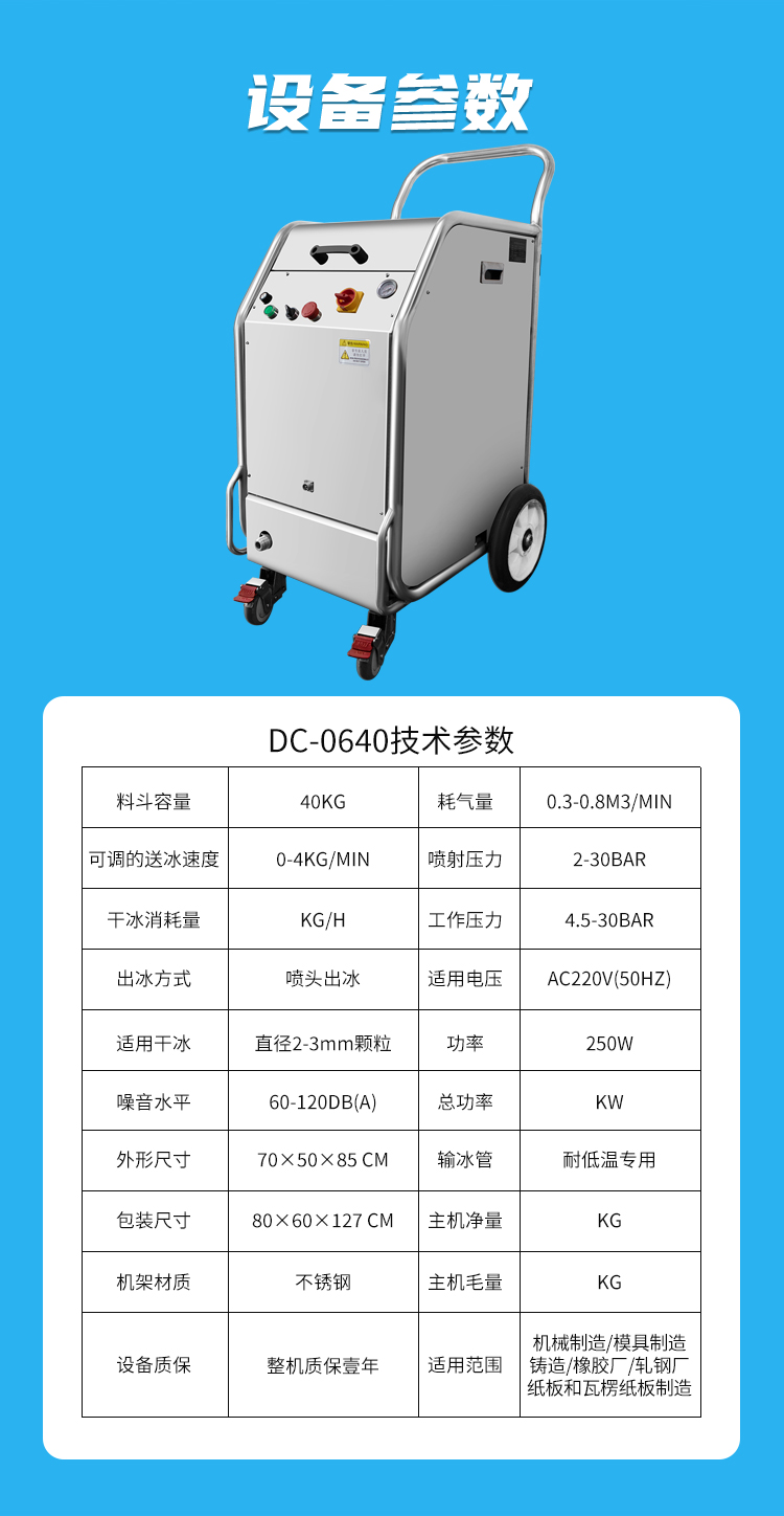 DC-0640優(yōu)勢:DC-0640顆粒干冰清洗機,干冰儲存容量大,清洗時間長。